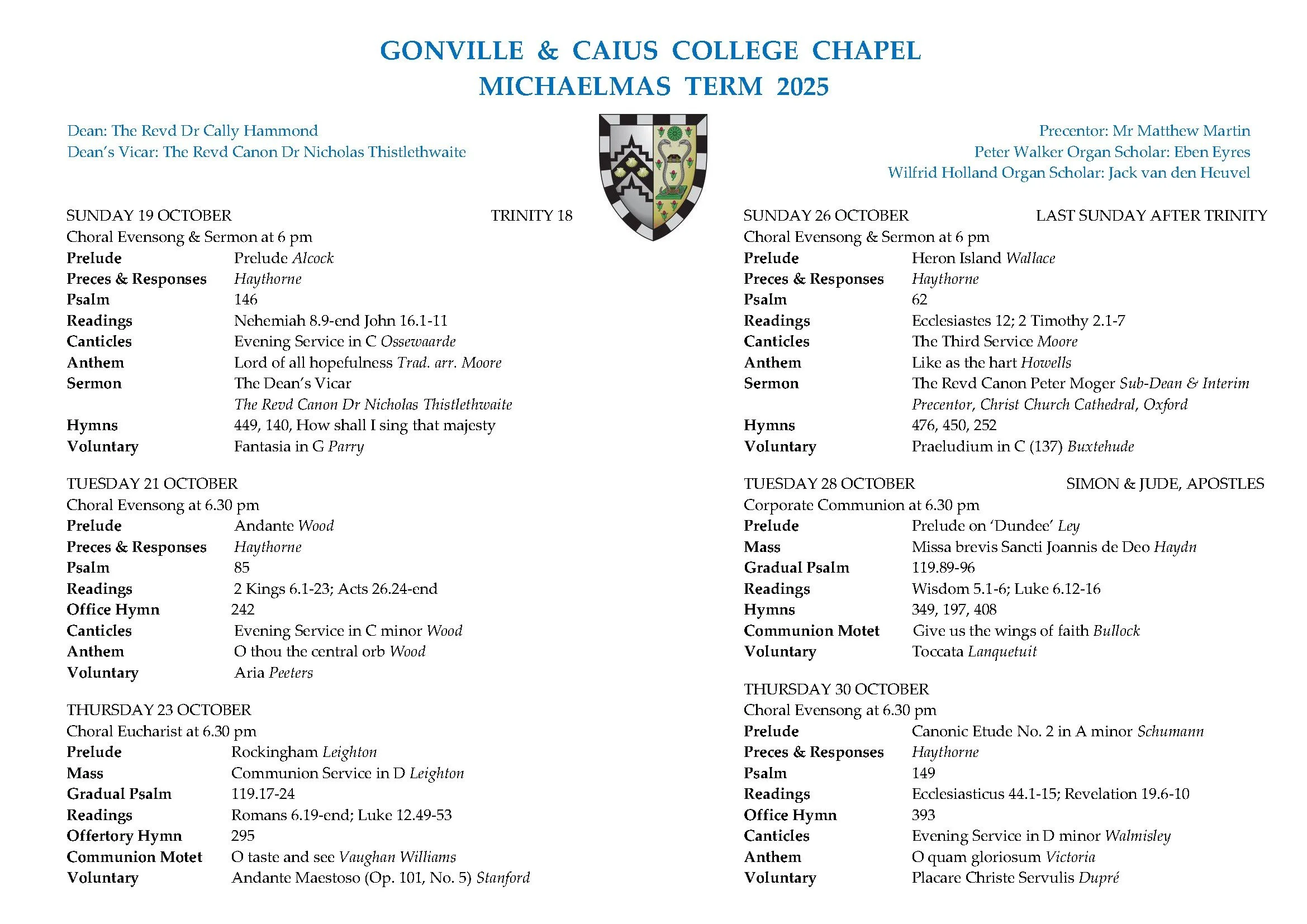 The music list for the start of Michaelmas term is now available. Click here to view.