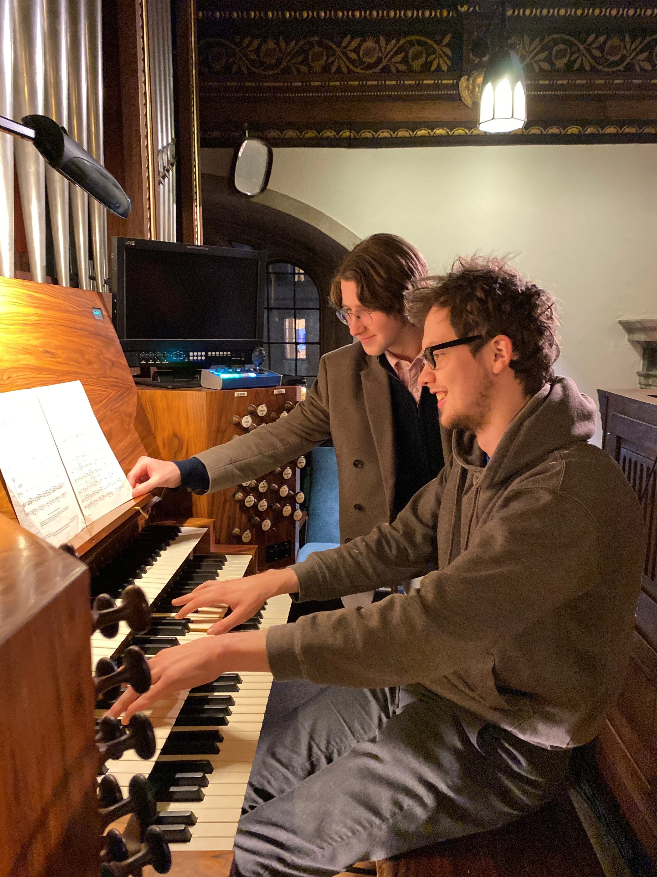 Eben Eyres- Peter Walker Organ Scholar (playing the organ) and Jack van den Heuvel - Wilfird Holland Organ Scholar